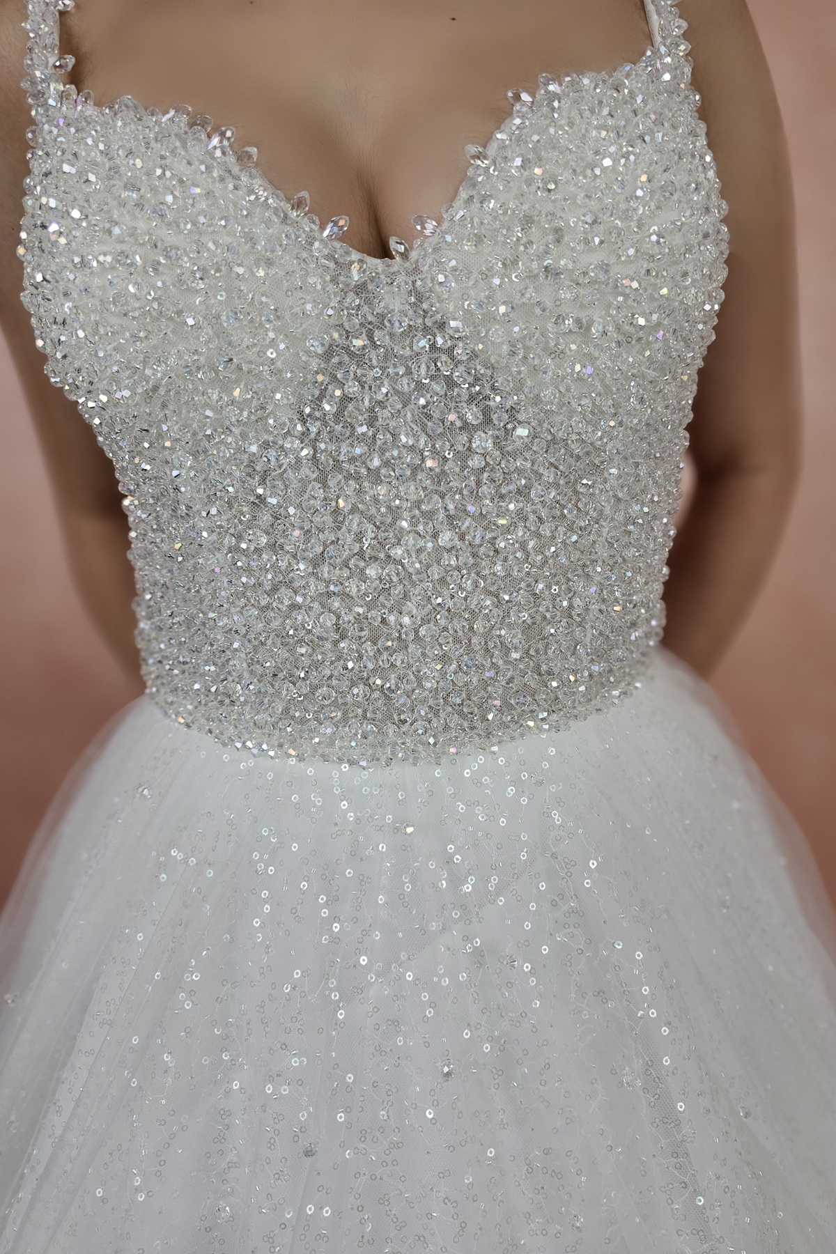 Özel gününüzde zarafetin ve güzelliğin simgesi gibi hissetmeyi hak ediyorsunuz. Derin V dekolteli ve Komple Taş İşlemeli Gövdeli A Kesim Gelinlik, ışıltılı inceliğin özünü temsil ederek koridorda ilerlerken tüm gözlerin üzerinizde olmasını sağlar. Güzel anılar yaratacak ve masalsı bir düğün hayallerinizi gerçeğe dönüştürecek bir gelinlik.