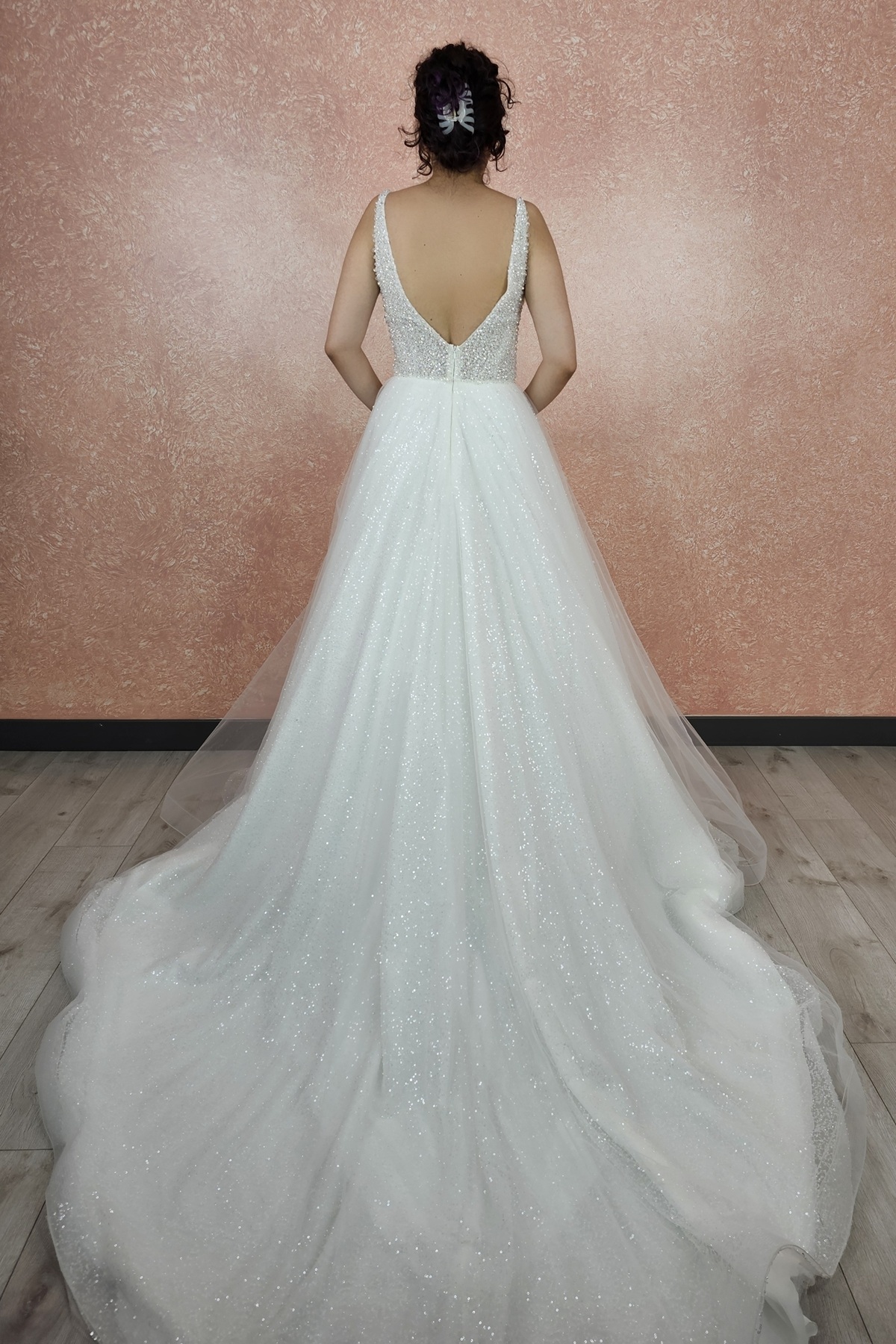 Detaylara özen gösterilerek hazırlanmış, Derin V dekolteli ve Komple Taş İşlemeli Gövdeli A Kesim Gelinlik, rahat bir kalıp ve olağanüstü bir işçilik sağlar. Yüksek kaliteli kumaş kusursuz bir şekilde sarılarak doğal güzelliğinizi artırır ve zarafet yayar. Her bir taş dikkatlice yerine dikilerek, uzaktan olduğu kadar yakından da nefes kesici bir gelinlik ortaya çıkıyor.
