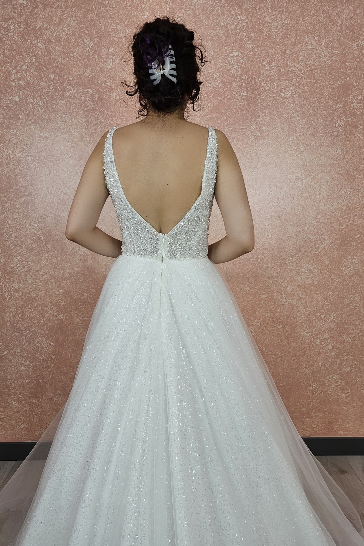 Derin V dekolteli ve Tamamen Taş İşlemeli A Kesim Gelinliklerin ışıltılı güzelliği ve zamansız inceliği ile büyülenmeye hazırlanın. Bu zarif gelinlik, zarafet ve ihtişam yayan bir gelin yaratmak için A kesim silüet, derin bir V dekolteli ve karmaşık taş işlemeleri birleştiren gerçek bir şaheserdir.