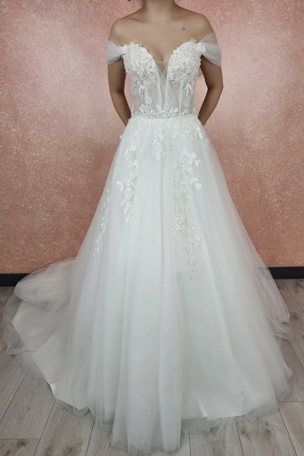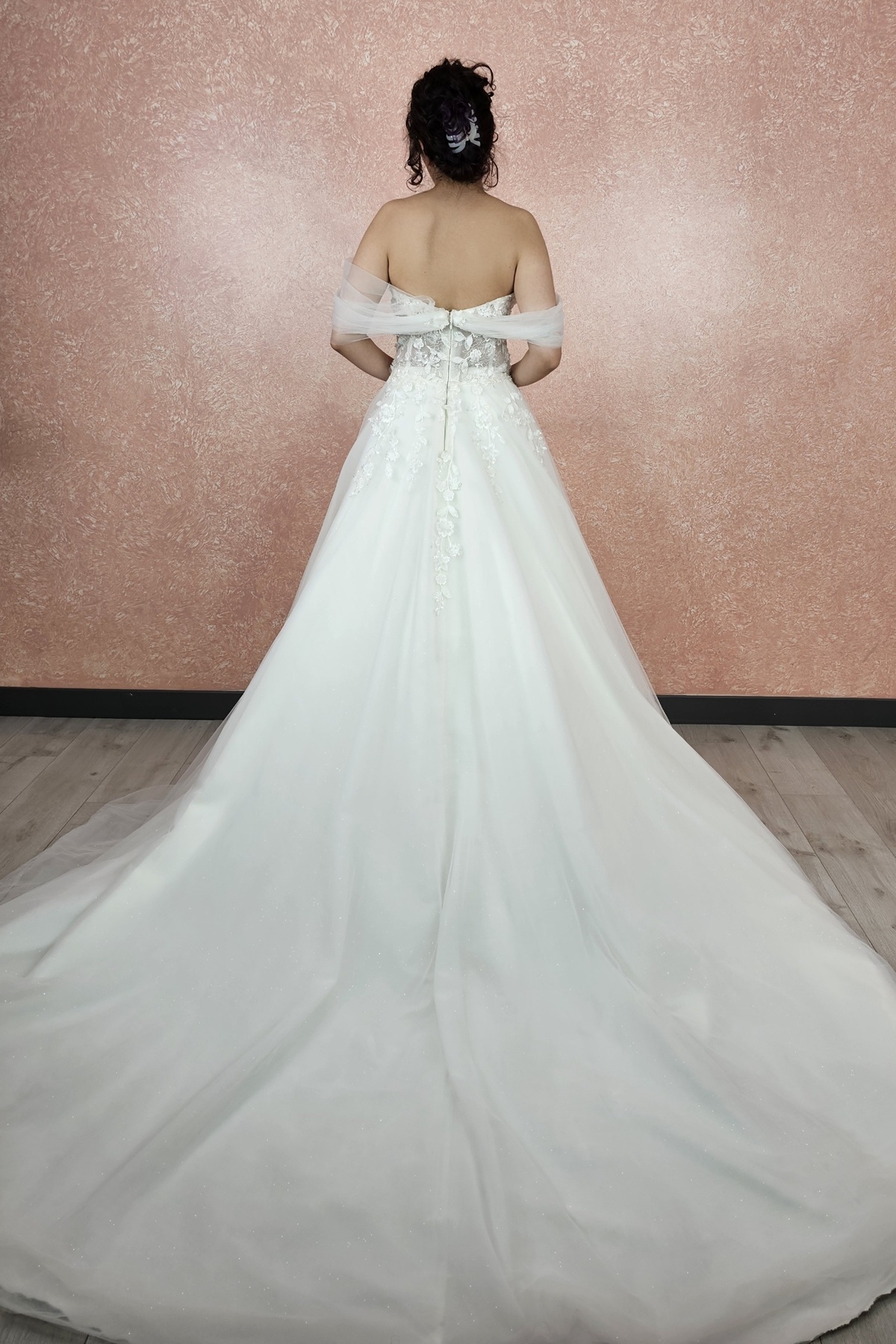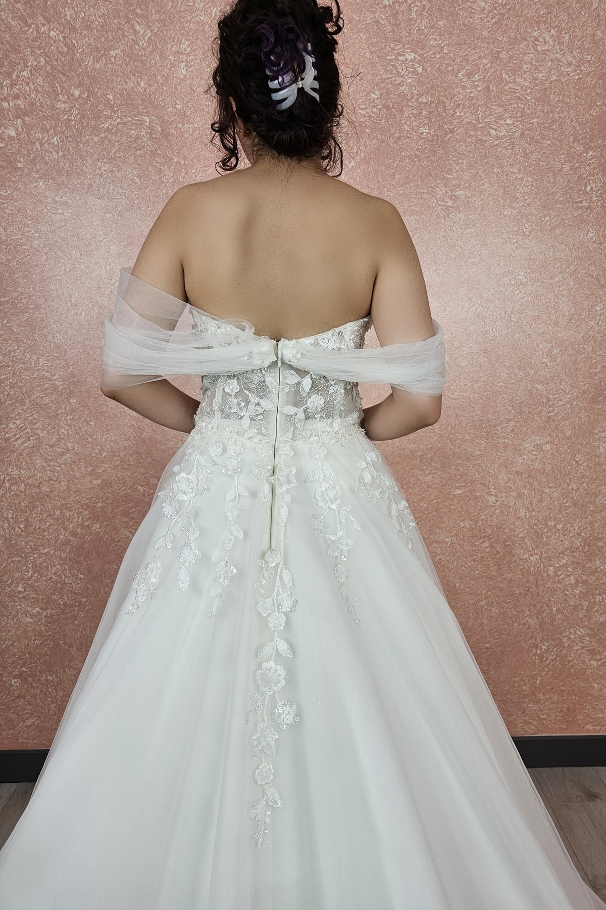 Straplez, kalp yakalı, romantik tül kollu, bel kısmında balen ve transparan detaylı, dantel süslemeli tül etekli A kesim helen gelinlik zarafeti ile bakışları üzerinde topluyor.