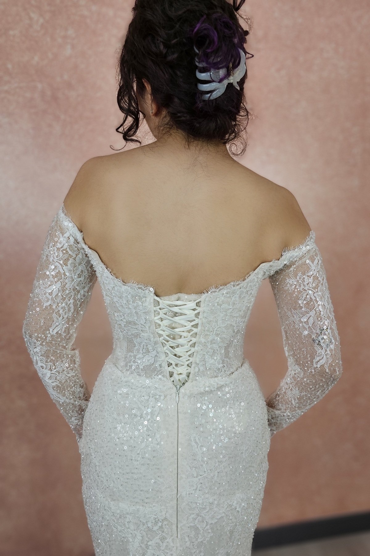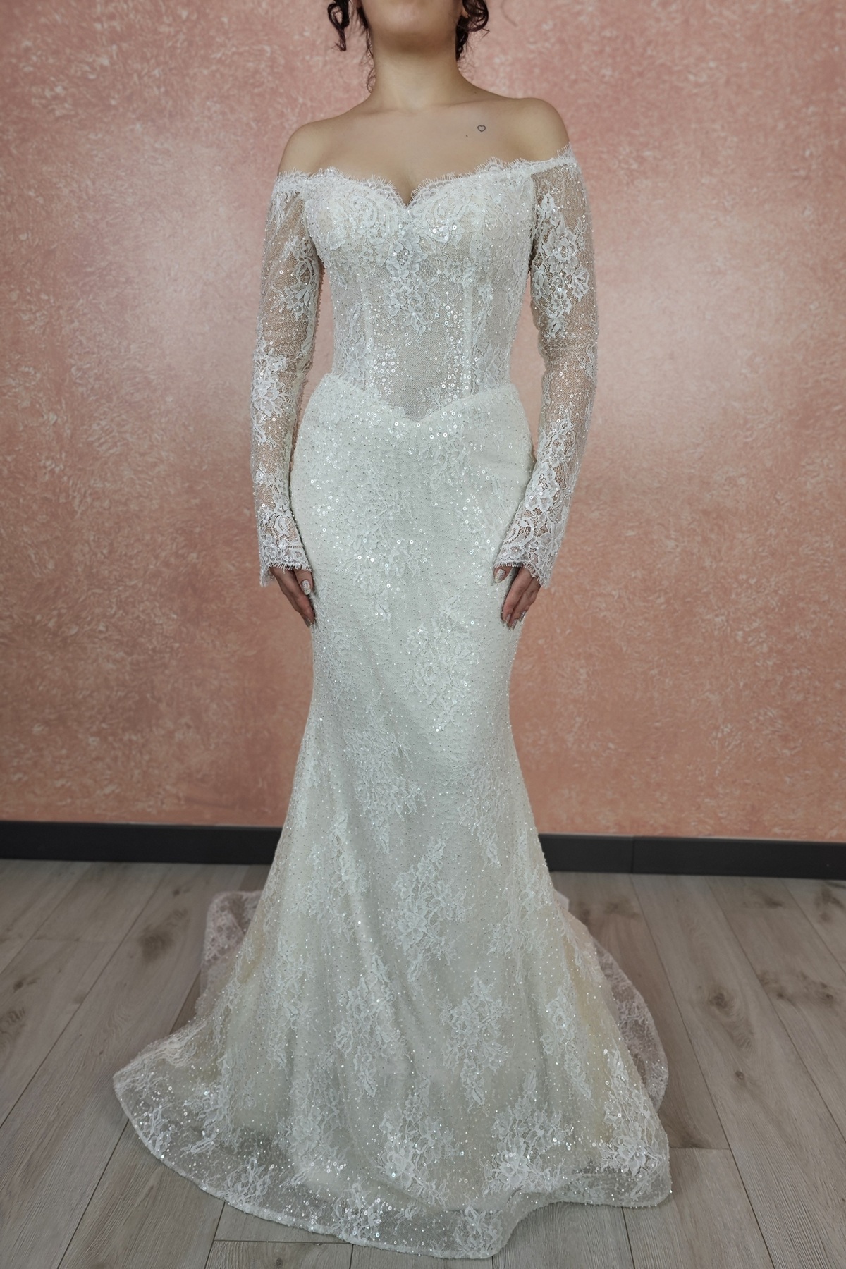 Uzun dantel süslemeli kollu, lez dantel straplez balık gelinlik. Demonte Eteği ile tüm gözleri üzerinde topluyor.